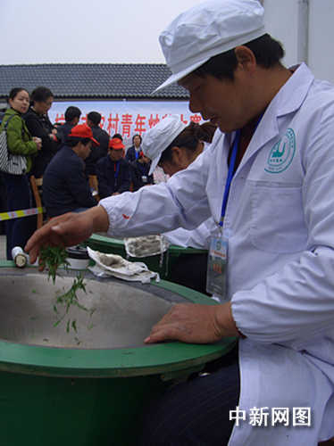 上午9點(diǎn),杭州市農(nóng)村青年炒茶大賽開始。30多口炒茶鍋分成兩列排開,選手們挽起袖子,在鍋底抹上一點(diǎn)茶樹油,抓上剛剛采摘的春茶青葉丟下鍋。不停地拋、捫,兩分鐘時間,一股清新的茶香彌漫開來。
