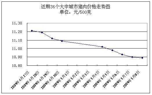 中新網(wǎng)5月11日電 據(jù)國家發(fā)展改革委價格監(jiān)測中心監(jiān)測,上周(2009.5.4-2009.5.8,下同)36個大中城市集市、超市豬肉(精瘦肉)平均零售價格每500克為10.94元,與前一周(2009.4.27-2009.4.30,下同)相比下降1.88%。