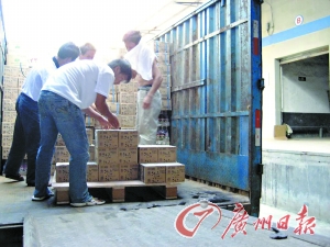 搬運工人正在將查處的假冒產(chǎn)品搬運上車。