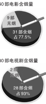 從2007年開始,中國控煙協(xié)會每年都會對熱播的國產(chǎn)影視劇中的吸煙鏡頭進行監(jiān)測統(tǒng)計。對2009年熱播的40部電影和30部電視劇進行的監(jiān)測結(jié)果顯示:在40部電影中有9部電影完全沒有煙草鏡頭,31部影片有煙草鏡頭,占影片的77.5%;30部電視劇中,2部沒有煙草鏡頭,28部有煙草鏡頭,占電視劇比例的93%。