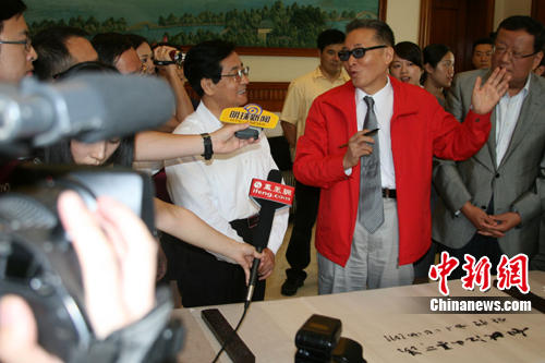 李敖寫罷擱筆。在一旁的趙洪祝出人意料拿起筆,在李敖題字“如此江山真可羨”的“真”字上補了一筆,原來剛才李敖題字筆墨不勻,真字上沒有出頭。