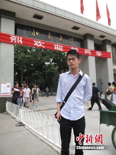 今天上午10時左右,身著藍條襯衫、深藍褲子,個子高挑的李戡終于出現(xiàn)了。有北大女生發(fā)出了驚呼:“看,他臉上還有小痘痘呢!”李戡的媽媽今天陪他過來,她表示沒想到兒子今天上午被媒體全程跟隨——從報到、辦理飯卡到宿舍,再到校外,李戡就一直在不停地回答問題。