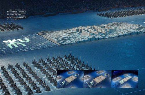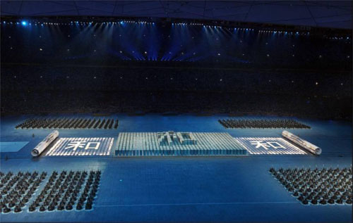 2008年北京奧運(yùn)會(huì)開(kāi)幕式上,幾百名演員扮演的活字印刷字模通過(guò)不斷變幻,用大篆、小篆、楷書三種不同字體展現(xiàn)了同一個(gè)漢字——“和”。
