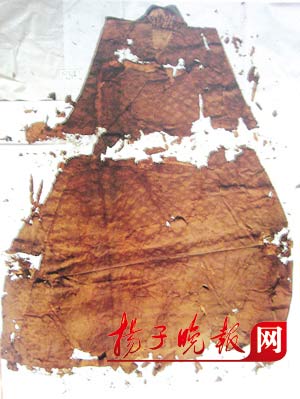 照片中,一堆已經(jīng)損壞的咖啡色織物,殘缺不全、圖案斷續(xù)、毫無(wú)光澤,就好像枯萎的花朵一般。如果不是專(zhuān)家介紹,沒(méi)有人會(huì)將它們和明代皇帝、云錦聯(lián)系在一起。這件“中單”出土于萬(wàn)歷帝棺內(nèi)中部中間,剛剛出土?xí)r,是金光閃閃的,但是在與空氣接觸后,迅速氧化、褪色。通過(guò)云錦研究所的復(fù)制,記者見(jiàn)識(shí)了“紅八寶四合云紋綢交領(lǐng)中單”當(dāng)年的風(fēng)采,“中單”無(wú)袖,里與面之間夾了一層薄棉絮,凸于表面的紋樣是象征“物華天寶”的八寶紋。據(jù)介紹,此件“中單”類(lèi)似于現(xiàn)代的襯衫,“小衣之外、大衣之中”,尺寸一般小于袞服、龍袍一寸,長(zhǎng)四尺。