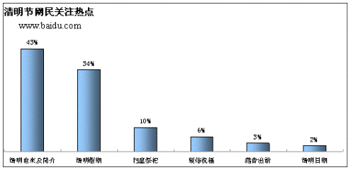 據(jù)了解,這是該中心第一次發(fā)布有關(guān)清明節(jié)的調(diào)研報(bào)告,報(bào)告的數(shù)據(jù)來源于百度網(wǎng)頁搜索以及百度知道、博客搜索等平臺。作為全球最大的中文搜索引擎,百度每天接受數(shù)億次查詢,這為研究網(wǎng)民關(guān)注的焦點(diǎn)和社會熱點(diǎn)話題提供了強(qiáng)大的數(shù)據(jù)支撐。
