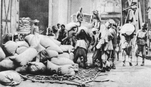華工和英國(guó)部隊(duì)在法國(guó)的一處停車場(chǎng)裝卸糧食