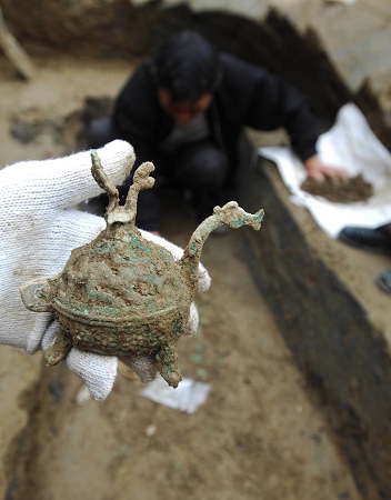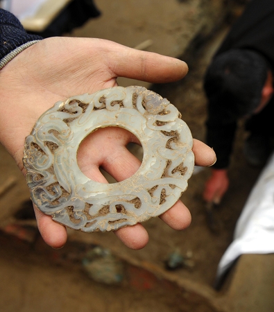 核心提示:近日,考古人員在襄樊市長虹路一建設(shè)工地進(jìn)行搶救性發(fā)掘時(shí),發(fā)現(xiàn)一大型魏晉早期墓葬,并從該墓葬后室中發(fā)掘出玉璧、水晶珠、青銅熏爐等數(shù)十件珍貴器物。
