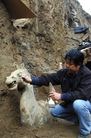 近日,考古人員在襄樊市長虹路一建設(shè)工地進(jìn)行搶救性發(fā)掘時(shí),發(fā)現(xiàn)一大型魏晉早期墓葬,并從該墓葬后室中發(fā)掘出玉璧、水晶珠、青銅熏爐等數(shù)十件珍貴器物。專家們從出土的文物分析,該墓應(yīng)是魏晉早期的夫妻合葬墓,墓主人的身份相當(dāng)于大將軍級(jí)別。隨后,考古人員在發(fā)掘、清理前堂文物時(shí),又發(fā)現(xiàn)了一匹與真馬體形接近的青銅馬。到昨天,整個(gè)銅馬已露出泥土80厘米高。據(jù)初步分析,銅馬高度為1.8米左右,重約2噸。