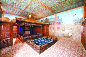 上午,記者在修復(fù)完工的倦勤齋內(nèi)看到:倦勤齋共面闊9間,以木裝修隔成了上下兩層的凹字形仙樓。最巧妙的是,齋內(nèi)各房間之間均以隔扇、檻窗、落地罩、炕罩等隔成相對(duì)獨(dú)立的空間。齋內(nèi)用歐洲透視方法繪出的絹面通景畫覆蓋了整個(gè)房間,據(jù)介紹整個(gè)倦勤齋有70余張畫,其中頂棚處有12張,全部約170平方米,如此大量反映18世紀(jì)歐洲美學(xué)對(duì)中國(guó)裝飾藝術(shù)影響的通景畫,不僅在紫禁城而且在全中國(guó)也是絕無(wú)僅有的。當(dāng)年乾隆皇帝觀戲的小戲臺(tái)被裝飾得古色古香,戲臺(tái)上方的天花板上全部都是枝藤茂密的紫羅蘭圖案通景畫,房間的墻壁上則細(xì)膩地描繪了紫禁城里的建筑和山石景色。而在以仙樓圍成的中廳內(nèi),精美的竹絲鑲嵌、玉雕和木雕藝術(shù)同樣令人嘆為觀止。