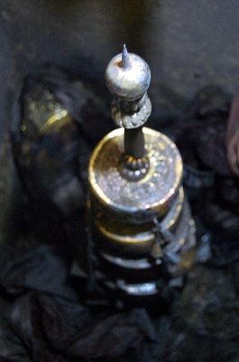 據(jù)了解,目前包裹“塔王”的錦緞已經(jīng)基本打開,專家用蒸餾水添加化學藥品對錦緞進行了去污和消毒,對撒在錦緞上的金粉進行了加固。考古人員從夾縫里取出一些小塊的絲織物。令考古專家驚奇的是,在絲織物上發(fā)現(xiàn)了“墨書”文字,保存十分完好。經(jīng)歷近千年的文字仍然清晰可辨,專家對文字進行研究后發(fā)現(xiàn),文字上大多書寫的是捐獻者的名字。考古人員把絲織物儲存在一個溫度、濕度恒定,沒有紫外線的環(huán)境下保護起來。目前,“塔王”已完全露出上半身的真容,從上往里探視,可以看見塔腰處鑲嵌了許多精美的各色寶石。在清理中,考古人員又從四邊的夾縫中吸出了許多寶物,有各類寶石、玻璃器皿、銅錢等文物,“有的珠子可能是塔身上掉下的,也有的是捐獻者放進去的!币晃唤谠M地庫看過鐵函的相關(guān)人士告訴早報記者。