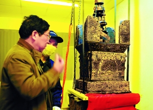 南京日報記者在現(xiàn)場看到,昨天15時28分,阿育王塔整體起吊至函口位置,至此,請出寶塔的工作暫時告一段落?脊湃藛T小心翼翼地檢查紅綢布里層和寶塔表面,尋找從塔上脫落的文物。工作人員揭開包裹在塔身的紅綢布,精美絕倫的千年寶塔完整地呈現(xiàn)在世人面前。寶塔通體鑲滿了大小不一的各色寶石,塔剎、蕉葉、塔身和塔座部分裝飾著精美的纏枝蓮和佛像圖案,上面還有舍身飼虎、干生舍眼等佛傳故事。此外,塔身四壁還可看到“天下民安”、“風調(diào)雨順”、“皇帝萬歲”等祈福文字。市博考古隊副主任祁海寧告訴記者,阿育王塔不但“體型最大”,制作工藝也堪稱“無與倫比”,“整個寶塔是用泡釘將銀鎏金皮鉚接在木質(zhì)內(nèi)托的表面,塔身上的精美圖案,是當時的工匠在鎏金蒙皮上鍛制出來的,如此精密復雜的工藝令人嘆為觀止。”在寶塔出函直播現(xiàn)場的鳳凰衛(wèi)視主持人、著名文化學者王魯湘激動地表示:“這次從長干寺鐵函內(nèi)請出的阿育王塔,對于考古界和佛教界而言,都稱得上是一次驚世大發(fā)現(xiàn),其文物價值不可估量。”