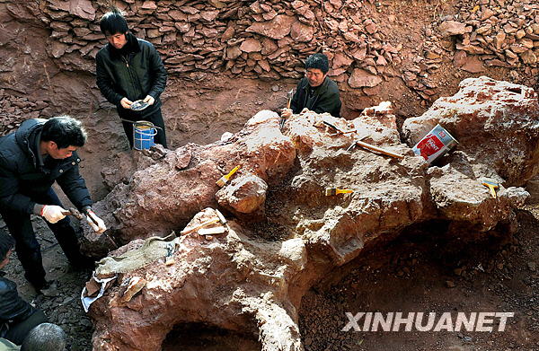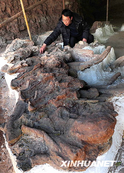 河南省汝陽(yáng)縣恐龍化石發(fā)掘近日又有重大進(jìn)展,在汝陽(yáng)縣劉店鄉(xiāng)發(fā)現(xiàn)了成片密集化石區(qū),出土的恐龍化石形體巨大,粗壯異常,其中最大的一塊長(zhǎng)3.3米、寬2.3米。經(jīng)專家認(rèn)定,這塊巨型恐龍化石比2007年7月命名的亞洲最大恐龍化石“汝陽(yáng)黃河巨龍”大很多,究竟屬于什么恐龍屬種還需進(jìn)