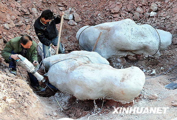 在汝陽(yáng)縣劉店鄉(xiāng)圣水溝村,工作人員將挖掘出的大型恐龍化石經(jīng)過科學(xué)分割后打上石膏,以便妥善保存(12月1日攝)。新華社記者 王頌 攝
