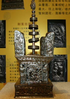 杭州西湖邊的雷峰塔,除了讓人聯(lián)想到白娘子和許仙的浪漫傳奇,那座2001年在地宮出土的銀制“阿育王塔”也是其重寶。但很多人不知道,“阿育王塔”還有一座“姊妹塔”——即天宮中的阿育王塔,因出土時破損嚴重,一直藏于文保部門。昨天,成功修復后的雷峰塔天宮銀質(zhì)鎏金阿育王塔首次與世人見面——浙江博物館專門進行了《天覆地載——雷峰塔天宮阿育王塔特展》,展出五代吳越國王錢俶鑄造、歷代民間仿造的阿育王塔30余座,其中1級品10余件,為國內(nèi)首次對阿育王塔的集中展示。