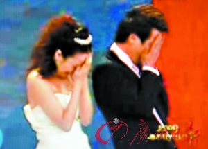 代表場(chǎng)景:千呼萬(wàn)喚之后,新郎“基仔”終于出場(chǎng)。這個(gè)染了發(fā)、梳著雞冠頭的廣東小伙子激動(dòng)地呼喊:“寶貝!”新娘也大喊:“基仔!”重復(fù)喊過(guò)兩遍之后,新郎新娘奔向?qū)Ψ,沒(méi)料到用力過(guò)猛撞了個(gè)滿懷。