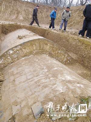昨天下午,記者來到位于雨花臺區(qū)鐵心橋附近一個叫馬家店的村落,這里正在進(jìn)行京滬高鐵的勘探施工。幾名工人告訴記者,他們負(fù)責(zé)在此日夜看護(hù)古墓,“因為古墓被發(fā)現(xiàn)時,墓門已經(jīng)被聞風(fēng)而來的盜墓賊破壞了,東面的一座古墓發(fā)現(xiàn)有人進(jìn)去過的痕跡!庇浾吲郎衔髅娴囊蛔拍梗灰娍脊湃藛T已經(jīng)挖出古墓的地表范圍,大部分墓頂已經(jīng)露出土層?脊湃藛T說,這座古墓比較大,外形保存基本完好,長約有8米,寬約3.5米,近幾日就準(zhǔn)備打開墓門!庇浾呖匆娔故业娜斏嫌幸欢芽此票粍舆^的亂磚,大約80厘米見方,考古人員介紹說,應(yīng)當(dāng)是過去盜墓賊留下的“杰作”。