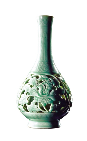 除了八方蓋盒,此次香港蘇富比春拍推出的明宣德青花藏文“平安頌”高足碗,預(yù)計(jì)成交價(jià)超過2000萬港元,清乾隆粉青釉浮雕芭蕉葉鏤空纏枝牡丹圖長頸膽套瓶,估價(jià)1500萬至2000萬港元,現(xiàn)今只有一件造型紋飾與它完全一致的玲瓏瓶,目前藏于北京故宮博物院。而這些拍品同屬一個(gè)專場——“玲瓏八寶——?dú)W洲私人清宮御瓷收藏專場”。