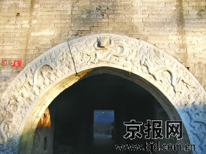 岱王廟坐落在盧溝橋西側的橋西街5號,坐北面南。遠遠望去,岱王廟建造的十分精巧,醒目。當地百姓俗稱它為大王廟或大廟。岱王廟的山門和戲樓,平面呈T字形布局,銜接緊密,融為一體,是一座上下二層硬脊歇山頂磚木結構的建筑。歷經滄桑歲月,房脊兩頭的吻獸早已蹤跡皆無,只有東西山墻頂部的鈴鐺排山,保留的還算完整。整座建筑用青磚砌成,磨磚對縫,對仗工整,呈現(xiàn)了清時期的建筑風格。山門的一層中央是石制拱形券門,券門兩旁是各一長方形豎窗。石制拱形券門刻有石雕,門首弧頂上方雕刻著探首的夔龍,在片片的祥云中翻轉騰挪,吞云吐霧。夔龍兩側各刻有兩條玩耍的蟠龍,像眾星捧月一樣游弋在探首的夔龍身邊。最為有意思的是,石制拱形券門兩側下部的石雕上,各刻有一只在水中山石間吐水的小獸,造型奇特,形態(tài)逼真,顯現(xiàn)出十分生動有趣的畫面,給整座石雕增添了一筆頑皮的色彩。整個券門上的石雕布局嚴謹,古樸典雅,雕工灑脫,莊重中不失諧趣,顯示出那個時代工匠們的高超技藝。