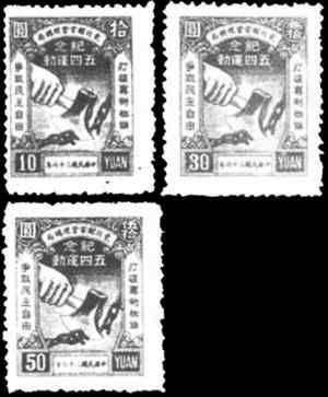 1947年5月4日,解放區(qū)東北郵電管理局發(fā)行紀(jì)念五四運(yùn)動(dòng)郵票1套3枚,分綠、淡棕、紫色三色,面值分別為10元、30元、50元。主圖為一支巨手持斧砍斷象征專(zhuān)制統(tǒng)治的鎖鏈,兩側(cè)空白邊框內(nèi)為兩條標(biāo)語(yǔ):“打破專(zhuān)制枷鎖”,“爭(zhēng)取民主自由”。這套郵票的設(shè)計(jì)者是張修平,他曾參考俄國(guó)十月革命后發(fā)行的郵票圖案,巨手握著寶劍砍斷鎖鏈,象征無(wú)產(chǎn)階級(jí)革命沖毀資本主義枷鎖。