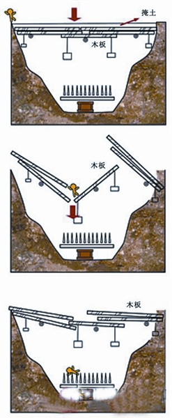 所謂連環(huán)翻板,即在墓道中挖掘深約3米以上的陷坑,長短與寬度視墓道具體情形而定,坑下分布約10厘米左右的刀錐利器?由蠈悠礁矓祲K木板,木板中間有軸,下綴一小型相同重量的物體,呈天平秤狀,板上有掩蓋物。若盜墓者踏上木板,板的一端隨之下陷,人必掉到坑內的刀錐之上。