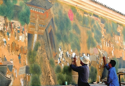該工程是由某商業(yè)公司負責。該公司現(xiàn)場負責人劉先生介紹,該幅《清明上河圖》只是大規(guī)模壁畫創(chuàng)作的第一步!拔覀儨蕚鋭訂T奚官營村村民,各家各戶的院墻上也畫上壁畫,使山上山下連成一體,打造‘亞洲第一壁畫村’”。目前,他們準備聯(lián)合奚官營村向上級申請成立專項旅游建設項目。