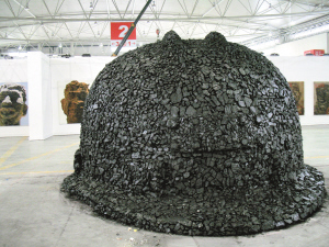 現(xiàn)場最扯眼球的作品是藝術(shù)家張建華的雕塑作品《礦工帽》。張建華說,這個(gè)礦工帽用了3噸煤塊貼滿,更像一座孤墳,他希望以此反映農(nóng)民工在社會(huì)發(fā)展過程中付出的沉重代價(jià)。