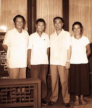 1961年7月初,我們在北京工作的堂兄爾輝結(jié)婚,因為他祖母和母親都在淮安老家,伯伯和七媽為他們在西花廳舉辦了婚禮,飯前參加婚禮的三十多人一起照了相,我去晚了沒趕上。飯后,七媽拉住我說:“你來晚了,沒趕上照相,又要參軍走了,來和伯伯照個相吧!本S世姐姐說:“金山也來晚了,一起照吧。”于是有了上面的這張照片。
