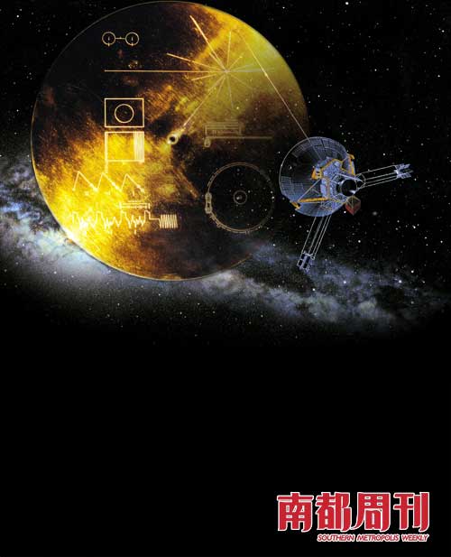 兩艘“先驅(qū)者號”飛船上都安裝有一個(gè)金屬板,它可謂是地球人送給外星人的“名片”。金屬板的左側(cè)刻有太陽系的圖案;右側(cè)刻有一個(gè)男人和一個(gè)女人的圖像,男人在招手致意;下方刻有太陽及太陽系九大行星的編碼。在兩艘“旅行者號”飛船上都裝有送給外星人的“郵包”:一個(gè)圓形鋁盒,里面放著一張鍍金視聽光盤。讀取光盤數(shù)據(jù)的說明寫在鋁盒的蓋子上。光盤上收錄了 115張圖片,介紹了地球文明最重要的一些資料 (如中國萬里長城、脫氧核糖核酸的分子式等);錄有地球人用 55種語言向外星人發(fā)出的簡短問候;存有 35種聲音信息;還有地球人的音樂文化(如巴赫的作品、爵士樂、中國名曲《高山流水》等)。