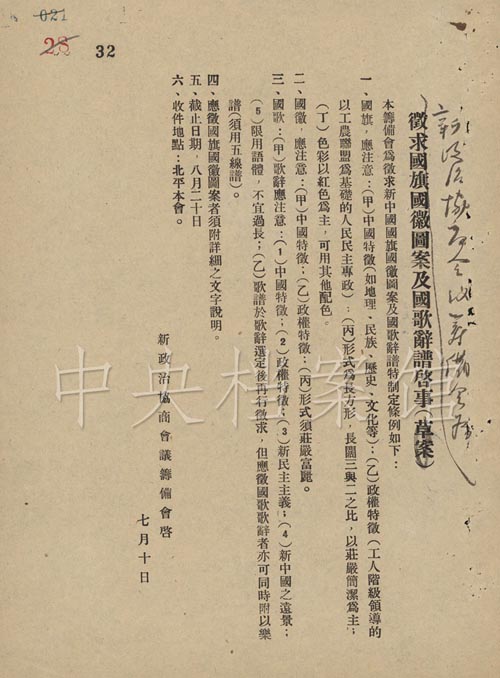 1949年檔案:第28集 新政協(xié)籌備會(huì)第六小組決定公開征求國(guó)旗國(guó)徽?qǐng)D案及國(guó)歌詞譜