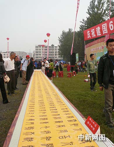 中新社襄樊9月29日電 (涂玉國)長一百一十米、寬零點(diǎn)八米,用五種字體書寫的毛主席詩詞的書法長卷,二十九日在湖北省襄樊市谷城縣博覽會(huì)上現(xiàn)身。這是該縣文化館副館長、書法美術(shù)家協(xié)會(huì)主席許祥強(qiáng)為慶祝新中國成立六十周年而作。