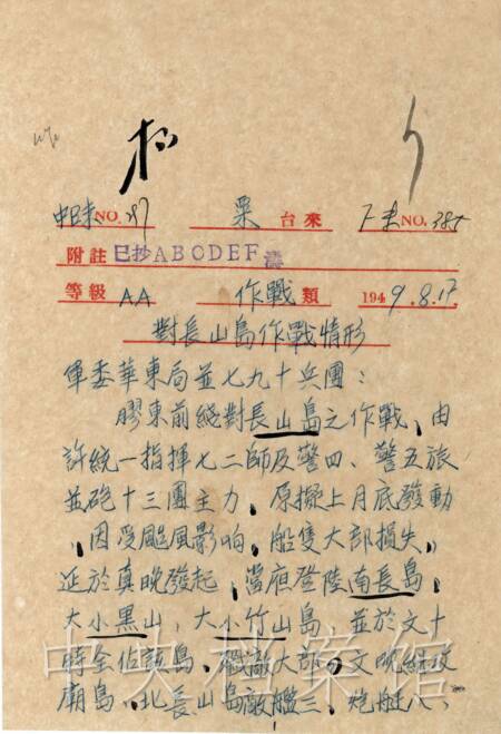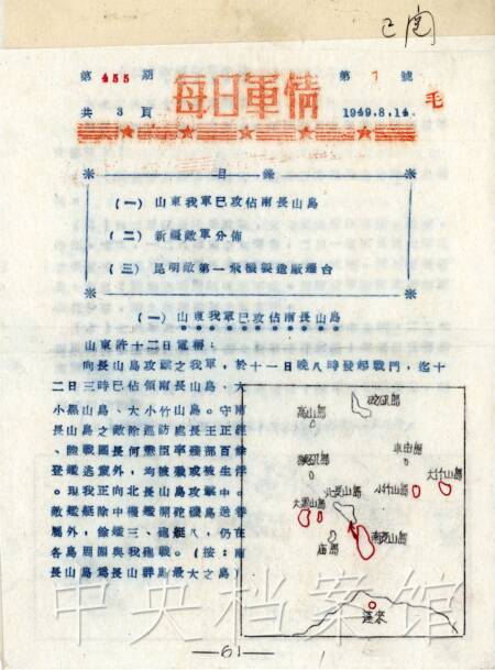 長山列島位于山東半島與遼東半島之間,扼渤海灣門戶,由南、北長山島等17個島嶼組成。山東半島解放后,退據(jù)長山列島的國民黨軍陸戰(zhàn)第2團等部,破壞漁業(yè)生產(chǎn)和海上交通,妄圖封鎖渤海灣。1949年8月,中國人民解放軍山東軍區(qū)指揮進行解放長山列島的作戰(zhàn)。11日晚,第24軍第72師和警備第4、第5旅分別從蓬萊縣劉家旺、欒家口、解宋營起渡。12日凌晨,警備第4、第5旅攻占長山列島兩翼大小黑山島、大小竹山島,牽制停泊在南北長山島的國民黨軍艦艇。第72師在友鄰配合下,接近南北長山島,并在炮火掩護下迅速登島,與國民黨守軍展開激戰(zhàn),上午攻占南長山島,下午占領北長山島。爾后以警備第5旅為主,向砣磯島、大小欽島、南北皇城島發(fā)展進攻。至20日,國民黨守軍殘部棄島逃遁,人民解放軍收復了國民黨軍隊占領的大小島嶼,殲國民黨軍15OO余人,山東省全境解放。