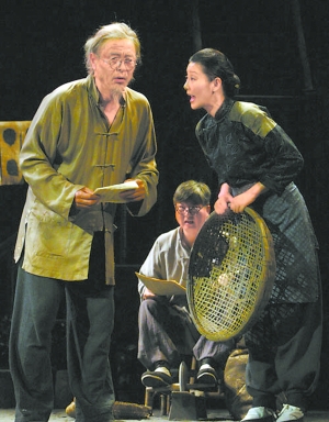 畢竟作者是初次染指舞臺(tái)劇,臺(tái)詞俏皮生動(dòng),人物個(gè)性鮮明,大段大段的“獨(dú)白”卻像是在寫(xiě)小說(shuō)。小說(shuō)往往容許單管獨(dú)奏,或花開(kāi)數(shù)朵各表一枝,戲劇除獨(dú)角戲外,必定是十指彈琴,彼此呼應(yīng)。幸虧何冰是一位壓得住臺(tái)的優(yōu)秀演員,那熱力四射的情感深度與舞臺(tái)張力,將大段大段的臺(tái)詞化成旁若無(wú)人的心靈傾訴,挽救了眾人臺(tái)詞空白的尷尬。也幸虧導(dǎo)演林兆華故意犯禁的巧妙處理,以群體角色靜默不動(dòng)或極少動(dòng)作,反襯苑大頭的情感井噴;以表現(xiàn)性的非現(xiàn)實(shí)場(chǎng)面,處理這一反常的劇作和生活情態(tài),出乎意表地使第三幕后段反而成為全劇最具特色的舞臺(tái)處理,從而使寫(xiě)實(shí)與非寫(xiě)實(shí)的界限變得模糊,或者說(shuō)開(kāi)拓了寫(xiě)實(shí)主義戲劇更為寬闊的表現(xiàn)空間。 (林克歡)