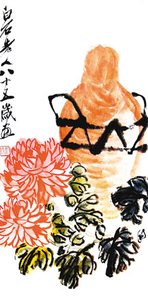 《菊酒圖》鮮明體現(xiàn)了白石老人“紅花墨葉”的花鳥畫風(fēng)格。畫中一叢秋菊,一壇老酒,構(gòu)圖簡(jiǎn)約;^以牡丹紅勾勒而出,與酒壇的赭石色一起構(gòu)成了明艷熱烈的主色調(diào),渲染了豐收后喜悅的情緒。此畫艷而不俗的關(guān)鍵,在于其用筆勁健生辣,不失文人畫的筆墨傳統(tǒng)。同時(shí)菊葉、酒筐及題款都是黑重色,對(duì)主色調(diào)進(jìn)行了有效的制衡,使畫面顯得富麗而穩(wěn)重,韻味無(wú)窮。