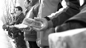 12月20日下午,北京008國(guó)際藝術(shù)區(qū)(以下簡(jiǎn)稱008藝術(shù)區(qū))門(mén)口,30余名藝術(shù)家站成兩排,手持從拆遷廢墟中撿來(lái)的磚頭,眼睛死死盯著遠(yuǎn)方,足足站了1個(gè)小時(shí)。