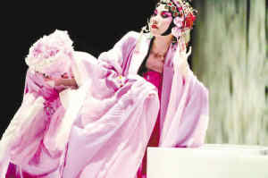 《中國(guó)制造——游園驚夢(mèng)》中,金星把自己大而化之了,將更多的動(dòng)作交給了群舞演員,自己卻在口唱昆曲的女旦后面,如同影子一樣重復(fù)相同的圓場(chǎng)動(dòng)作。一前一后,兩個(gè)杜麗娘,當(dāng)然可以看作形式上的設(shè)計(jì),但金星不會(huì)做一個(gè)簡(jiǎn)單的決定。衣飾更為亮麗的女旦交錯(cuò)了杜麗娘的身份和創(chuàng)作者自己的心聲,她是一個(gè)站在前臺(tái)的代言體,作品真正的主角則處在后面更為安全的位置上裊娜如煙!吨袊(guó)制造——游園驚夢(mèng)》可以看作是對(duì)《貴妃醉“久”》的延伸,借戲曲女旦代言,使作品充滿了傳統(tǒng)與現(xiàn)代社會(huì)的錯(cuò)亂,但社會(huì)性的時(shí)間對(duì)于癡人來(lái)說(shuō),從心理上是不存在的,在自我的世界中,只有性別的錯(cuò)亂、情感的矛盾和心理的惶恐。電影《霸王別姬》中,程蝶衣就是這樣一種人物。