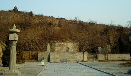 1 月6日,正值今冬最凜冽的天氣,村子里行人稀少,墓園里一片靜寂,兩扇朱紅色大門上面書有“曹植墓”三字,寒風(fēng)蕭瑟中,倍顯莊嚴(yán)肅穆。從側(cè)門進(jìn)入墓園中,一座低矮的山丘佇立,山上挺立的青松之間,各種叢木枝節(jié)盤繞,迎面便是青色古磚砌成的曹植墓。為防止雨水侵蝕,墓門現(xiàn)已經(jīng)封閉,無法進(jìn)入甬道和墓室。