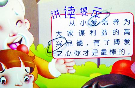 趙先生告訴記者,他買的是“寶寶第一本精典童話”叢書中的一本《神筆馬良》。仔細(xì)翻看,錯誤百出。在“從小愛培養(yǎng)為大家謀利益的高興品德”(如圖)這一句話中,居然出現(xiàn)兩處錯誤:其中“從小愛培養(yǎng)”中的“愛”應(yīng)為“就”;“高興品德”中的“興”,應(yīng)為“尚”。該書中為“哪吒”的“哪”注音竟是“na”……