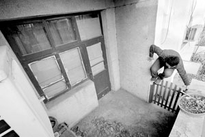 記者看到,陽(yáng)臺(tái)和樓道內(nèi)的屋門已鎖。陽(yáng)臺(tái)上破損的窗戶尚未修復(fù),仍保留著警方勘察現(xiàn)場(chǎng)時(shí)所貼的標(biāo)尺條。但窗戶內(nèi)側(cè)已用木板釘上,無(wú)法看清屋內(nèi)狀況。