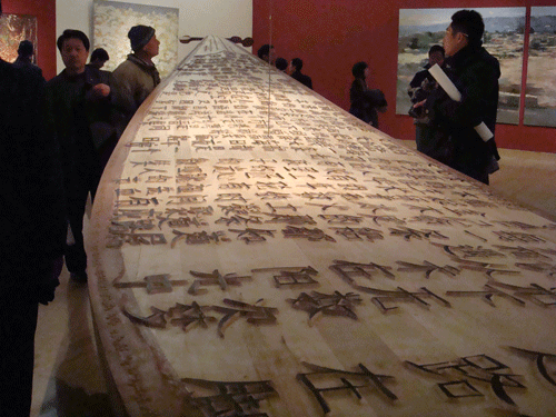 中國美術(shù)館的7號展廳中央圍了層層的觀眾,觀眾的包圍圈中是一艘甲板上刻滿漢字的木船,船的形狀好像一片樹葉,船體流暢的線條有搖曳之感,加上船頭的琴拴設(shè)計,俯視船身正面又好像一把古老的中國樂器。