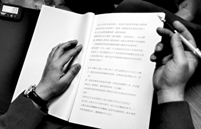 6點15分,接受完媒體采訪,周立波開始為晚上的演出做最后的“沖刺”。助手趕忙遞過一個文件夾,翻開后,周立波向記者展示,“這一次的提綱有點多,大概一兩千字!睖惿锨耙豢,記者發(fā)現(xiàn),這哪是提示綱要啊,完全可以當做一份詳盡的講稿。20余頁的A4紙,密密麻麻的文字,一些待會要拋的“包袱 ”一字不差地標注在此,用紅黑兩種顏色的斜體字區(qū)隔段落。周立波自言,以往的提綱大概只有兩三百字。單飛后的首演,其重要性不言而喻。