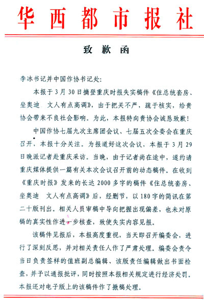 報(bào)道此事的《華西都市報(bào)》也向中國(guó)作協(xié)發(fā)出了致歉函。致歉函稱:本報(bào)于3月30日摘登重慶某媒體失實(shí)稿件,把關(guān)不嚴(yán),疏于核實(shí),給貴協(xié)會(huì)帶來不良社會(huì)影響。為此,本報(bào)特向貴協(xié)會(huì)誠(chéng)懇致歉。