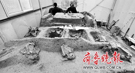 省文物考古研究所所長鄭同修介紹,車馬坑及馬坑等重要遺跡整體起取至濟(jì)南后,就采取了初步的防護(hù)措施,建設(shè)了臨時保護(hù)和工作用房,制定了保護(hù)工作方案。