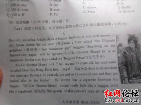 從紅網(wǎng)高校論壇相關截圖中,網(wǎng)友可以清晰地看到試卷是九年級英語試卷。試卷內(nèi)容簡單介紹了“犀利哥”在網(wǎng)絡上的突然出現(xiàn),并被稱為“乞丐王子”引起了網(wǎng)民的關注,并在第二段對“犀利哥”的身世等做了一個簡單的介紹。
