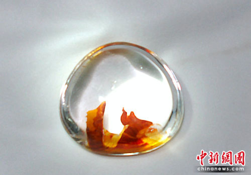 全國30多個單位的參展商帶來的珍品將整個展館擺放的滿滿當當。當記者來到水晶展柜前時,來自西安的張老板拿出了自己收藏了十多年的天然水晶“王者之鳳”。據(jù)他介紹,天然水晶是水受到擠壓后形成冰膜,吸取地下的氧化亞鐵和鎂元素后形成的!巴跽咧P”原產(chǎn)地為巴西,圖為一只頭戴王冠的鳳凰昂首挺胸站在山頂上,鳳尾向下飄垂,紅黃兩色代表著吉祥喜慶,極其罕見。