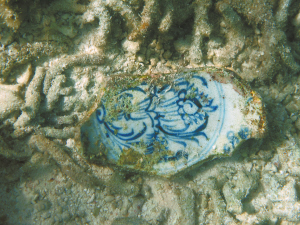 孟原召回憶,考古隊(duì)根據(jù)漁民提供線(xiàn)索發(fā)現(xiàn)該遺址,此遺址明顯經(jīng)漁民盜撈,表面散布圓形和不規(guī)則形盜坑,深約0.5-1米左右,為小艇螺旋槳吹打所致,海床翻動(dòng)較大,表面散落元代德化窯瓷器、景德鎮(zhèn)窯卵白釉瓷器和青花殘片,及龍泉窯青釉瓷器,遺物分布較密集,采集到的瓷器有青花、青瓷、白瓷、醬釉等,年代有元、明兩個(gè)時(shí)期。