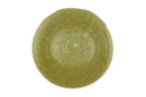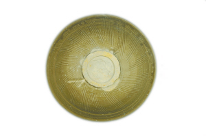枇杷黃、釉色潤、深腹、斂口、小圈足的小碗,碗口以下弧線內(nèi)收,器內(nèi)壁劃刻簡筆花草間配“之”字形篦紋,器外通體劃刻折扇紋,這種特色的中國瓷應(yīng)“珠光”大師之名被譽為“珠光青瓷”,馳名世界。