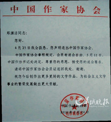 中國(guó)作協(xié)發(fā)給鄭淵潔的信中寫道:“5月11日,中國(guó)作協(xié)書記處決定,尊重您的意愿,接受您的退會(huì)要求。請(qǐng)將中國(guó)作家協(xié)會(huì)會(huì)員證退回我處。謝謝。祝您創(chuàng)作出更多更好的文學(xué)作品,為社會(huì)主義文學(xué)事業(yè)的繁榮發(fā)展做出更大貢獻(xiàn)”。信的簽章是“中國(guó)作家協(xié)會(huì)創(chuàng)聯(lián)部”,落款日期為6月4日。