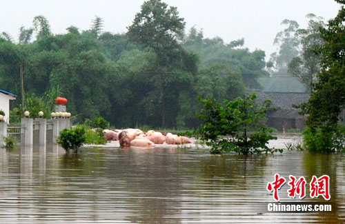 18日早上,中新網(wǎng)記者在受災(zāi)嚴(yán)重的重慶潼南柏梓鎮(zhèn)看到,雖然雨已經(jīng)停歇,但鎮(zhèn)上的洪水仍未褪去,多條街道的積水仍有半人深。洪水完全包圍了當(dāng)?shù)氐囊粋養(yǎng)豬場,近百頭被淹的活豬成片浮在水面上,據(jù)該場工作人員介紹,該豬場養(yǎng)的6000多頭豬均被洪水淹沒,僅17日便死了1000多頭豬。因豬場受困之處水位較深無法救援,豬場場主只能眼睜睜看著豬被洪水沖擊漂浮。