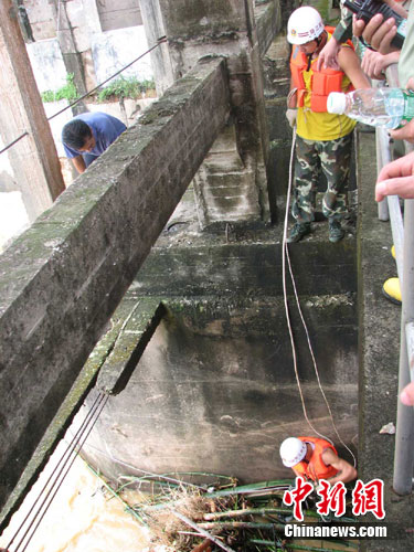 大壩閘門下,水深近6米,水流異常湍急,洪水也異常冰冷,且堆滿了垃圾,雖然消防官兵做好了安全保護(hù),并關(guān)好閘門,下游也安排了漁船隨時(shí)準(zhǔn)備救人,但是水下的情況不明,一不小心就有被洪水沖走或被水下雜物扎傷的危險(xiǎn)。在其中靠近岸邊的一個(gè)孔閘門,大樹與竹子卡在閘門的中間,閘門無(wú)法放下,消防官兵只能在異常湍急的水流中作業(yè),由于缺少著力點(diǎn),水下的消防官兵多次沒(méi)入水中,險(xiǎn)象環(huán)生,經(jīng)過(guò)近20多分鐘的作業(yè)才將雜物捆住。