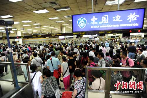 皇崗、福田口岸出境客流高峰一直持續(xù)到中午12時左右。邊檢站及時增開“旅行團專用通道”,同時采取入境執(zhí)勤隊增援出境執(zhí)勤隊、開足全部通道,旅客候檢時間不超過25分鐘。查驗現(xiàn)場雖人流攢動,但始終保持忙而不亂、通關順暢,秩序井然。完